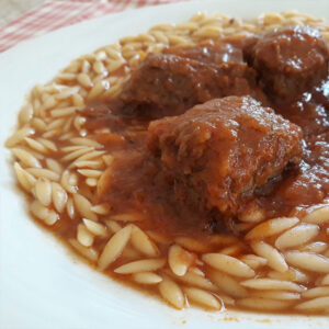 Μαριναρισμένο με λαχανικά και ντομάτα. Σβησμένο με κόκκινο κρασί μπρούσκο.